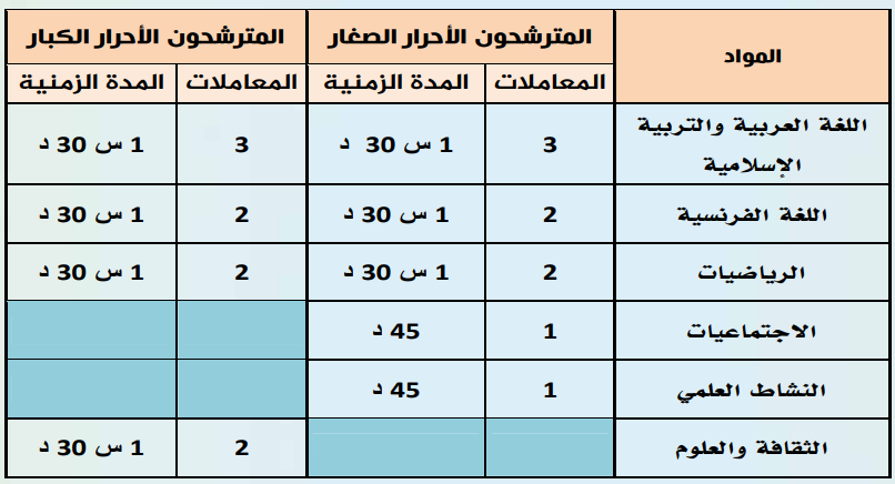 2- ت- المواد والمعاملات والمدة الزمنية لاختبارات امتحانات نيل شهادة الدروس الابتدائية ـ فئة المترشحين الأحرار