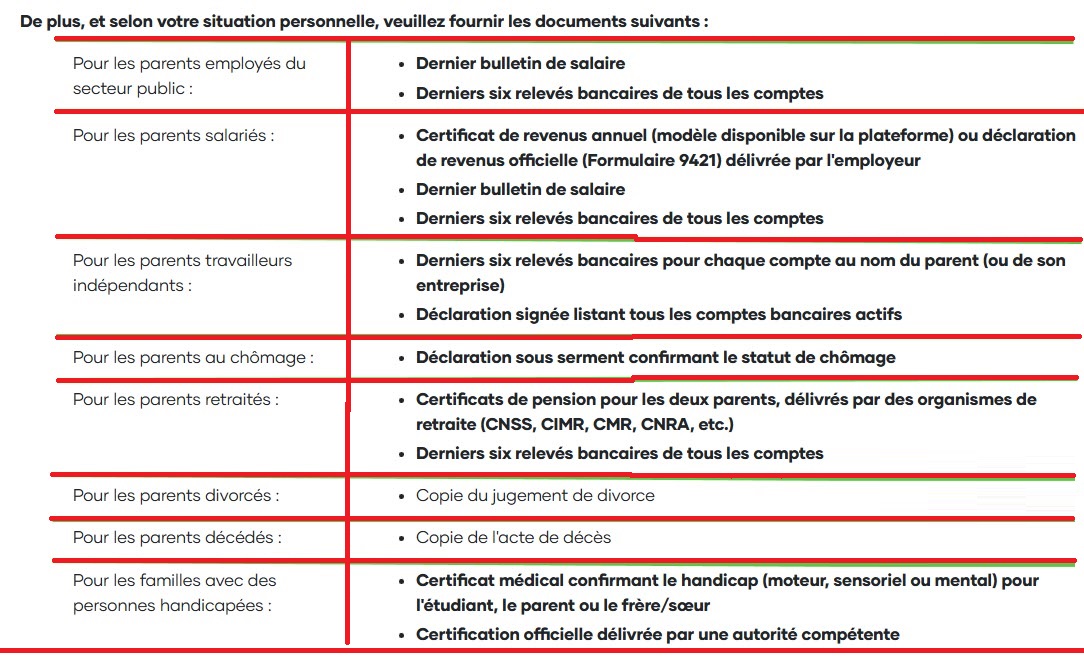 – أو حسب الوثائق التبريرية المرفقة أسفله و التي يتم تقديمها ، وهناك لجنة تدرس تلك الطلبات بعد القبول النهائي لتقرر في نسبة الاعفاء .