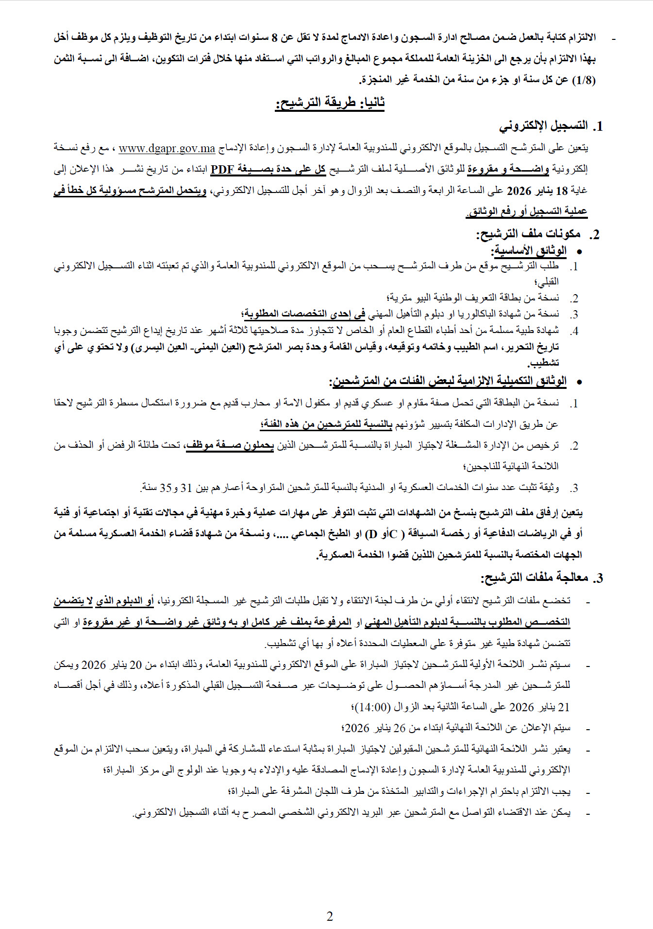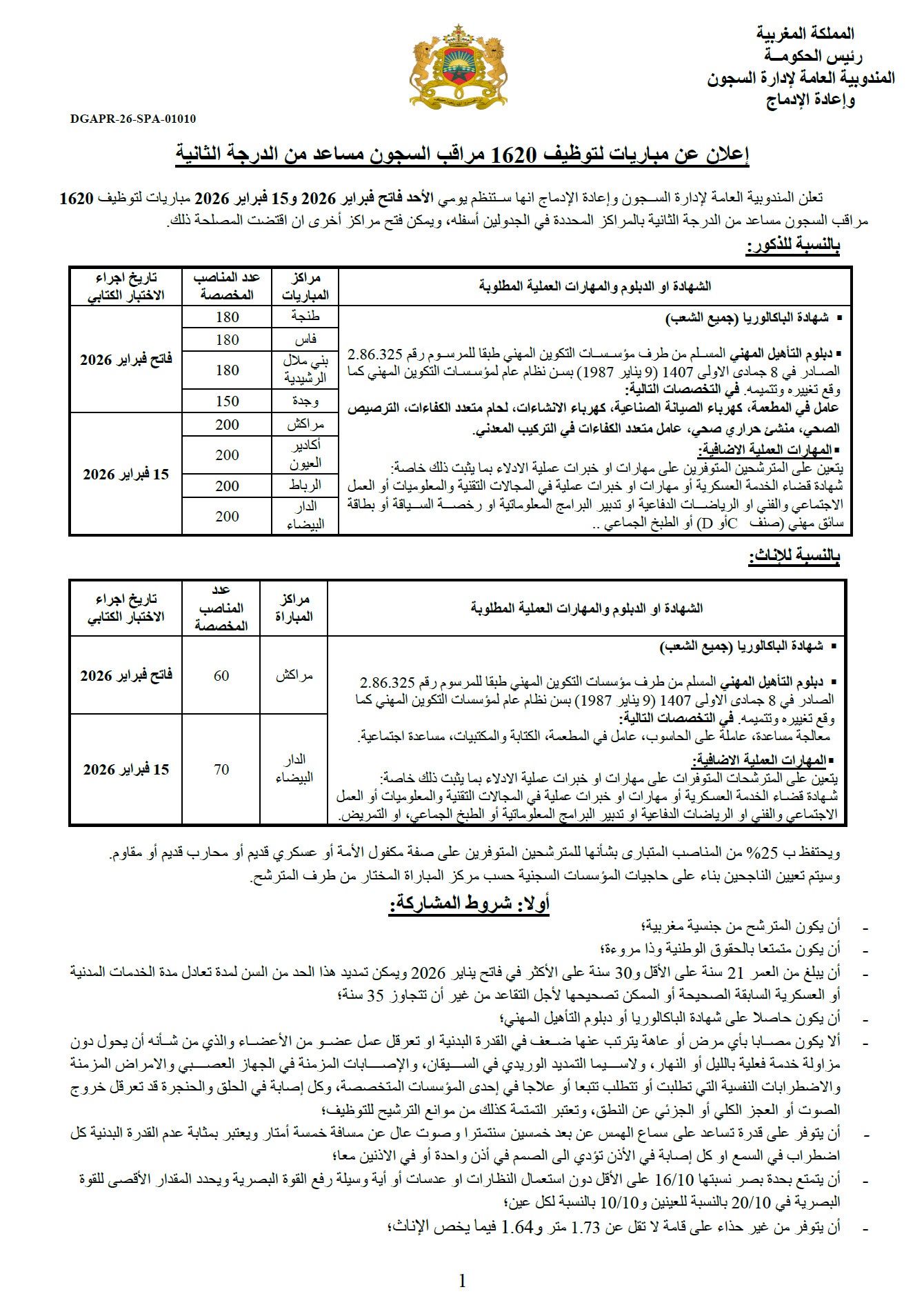 تعلن المندوبية العامة لإدارة السجون وإعادة الإدماج انها ستنظم يوم الأحد فاتح فبراير 2026 و 15 فبراير 2026 مباريات لتوظيف 1620 مراقب السجون مساعد من الدرجة الثانية بالمراكز المحددة أسفله ( طنجة – فاس- بني ملال الراشيدية – وجدة- مراكش- أكادير- الرباط – الدار البيضاء- العيون ) ، ويمكن فتح مراكز أخرى ان اقتضت المصلحة ذلك ، وتفتح المباراة في وجه المترشحين الحاصلين على شهادة الباكالوريا أو حملة دبلوم التأهيل المهني وذلك وفقا أسفله .