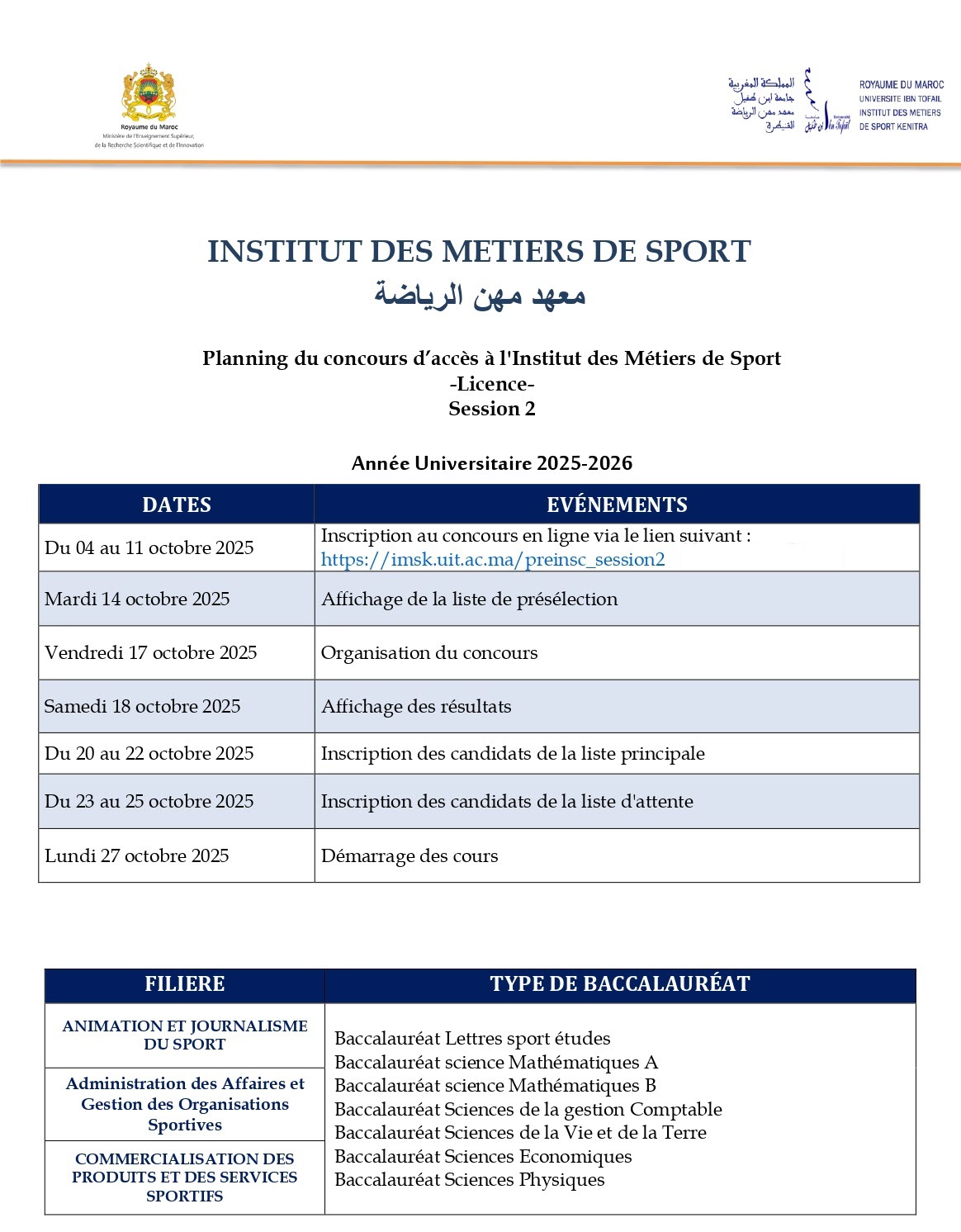 L’ Institut des Métiers de Sport de Kenitra annonce l’ouverture des pré-inscriptions en ligne 2ème Session pour l’accès aux études en Licence au titre de l’année universitaire 2025-2026.